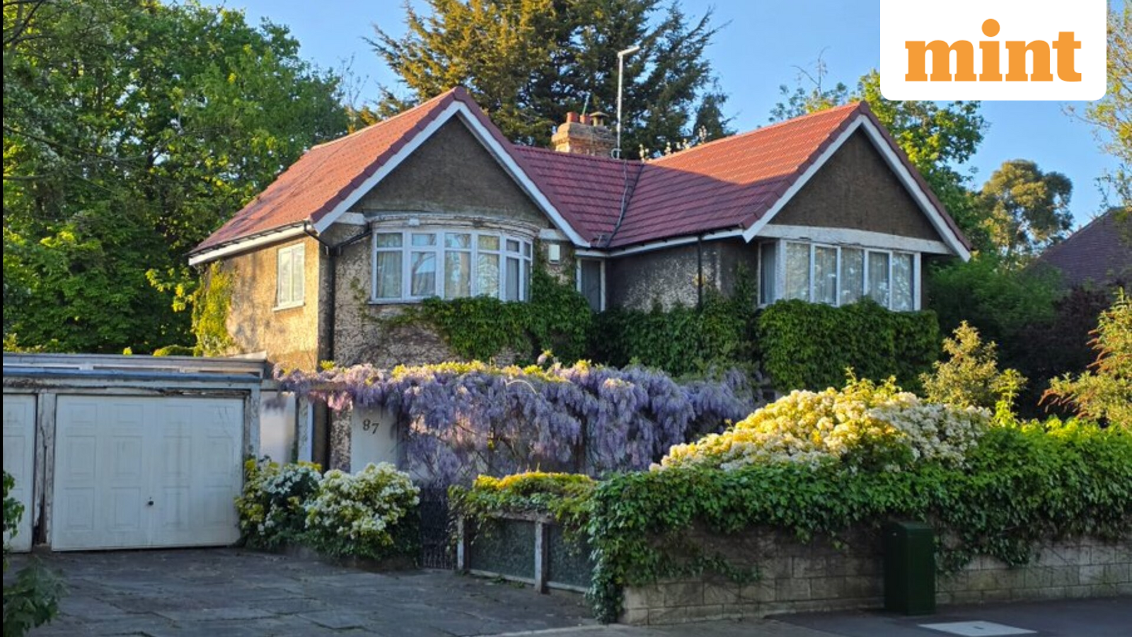 The house, as seen in the picture, is a single-story structure with sloping red roofs and multiple gables. Its facade has bay windows and is adorned with lush greenery, including a wisteria plant draped across the front. Gupta also pointed out that the property also includes a large backyard.