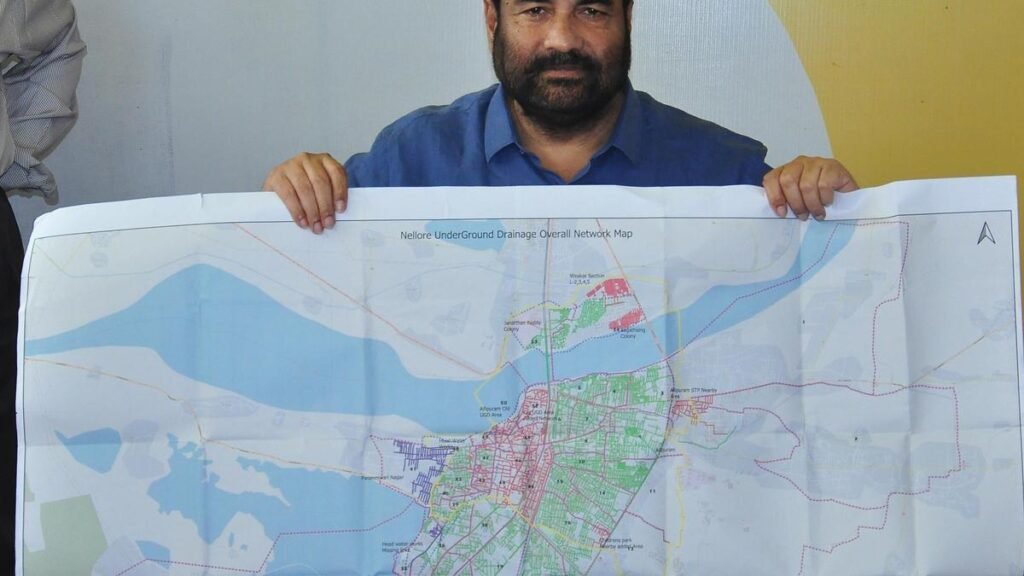MLA Kotamreddy Sridhar Reddy showing the map of Nellore Rural constituency at a media conference on Friday. | Photo credit: By arrangement