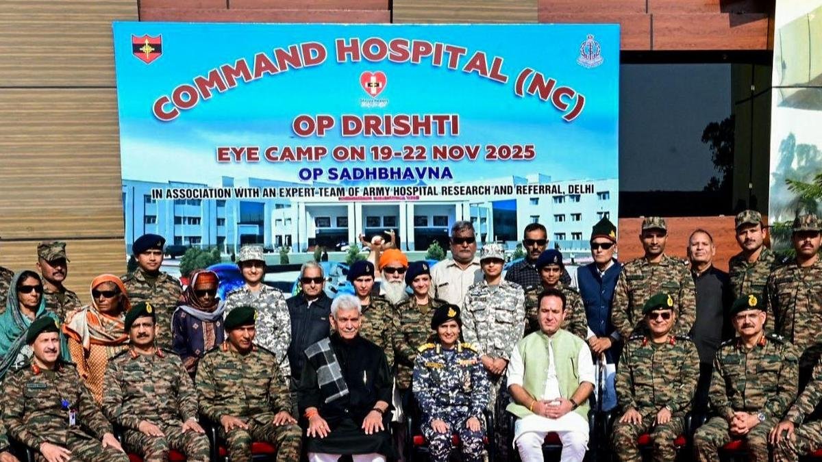 Jammu and Kashmir Lt. Governor Manoj Sinha in a group photograph during ‘Op Drishti’ Mega Eye Camp for Veterans, Veer Naris and Civilians organized at Command Hospital Northern Command in Udhampur on November 22, 2025. | Photo credit: ANI