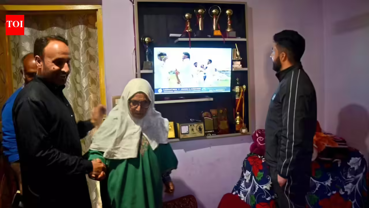 Auqib Nabi’s family members watch the Ranji Trophy final (TOI Photo) BARAMULLA: About 40 km west of Uri, near the Line of Control, lies the village of Sheeri. Along the Jhelum Valley road, northwest of Srinagar. There, a narrow lane off the main road takes you to the home of cricketer Auqib Nabi Dar. It’s barely wide enough for three people to walk abreast, but remember the address. Because that must not be forgotten in a hurry.Usually busy in the way that small mountain villages can be, however on Saturday the shops in Sheeri were open but business was slow. Men stood in the narrow streets, groups of boys gathered with mobile phones in their hands. It seemed aimless, but it had a purpose. They were constantly checking their phones, sharing updates, draining mobile data every minute and keeping up with the final score of the Ranji Trophy in far off Hubballi.