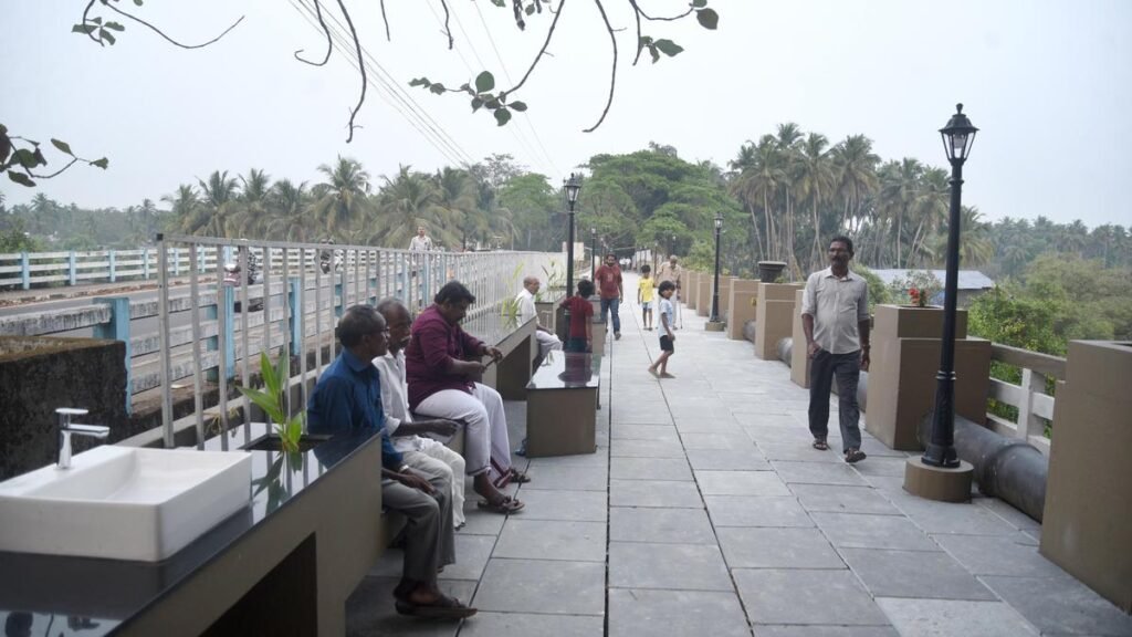 The old bridge, which had become dilapidated and overgrown with vegetation, has now been given a new look. The damaged handrails were repaired and the surface is paved with stones. Painting, electrification and related works were also carried out. Facilities included in the first phase include seating, a buffet, small kiosks, decorative lighting, ornamental plants and a clean sidewalk.