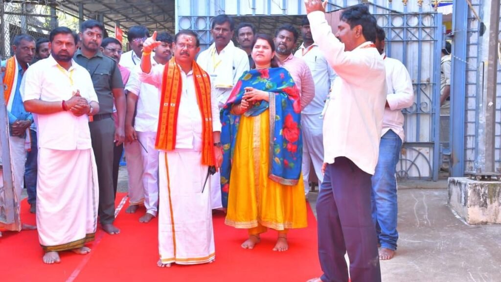 Collector Rajakumari Ganiya and temple executive officer M. Srinivasa Rao review the arrangements for the ‘Pagalankarana ritual’ to be held on Maha Sivaratri at the Srisailam temple on Saturday. | Photo credit: BY ARRANGEMENT