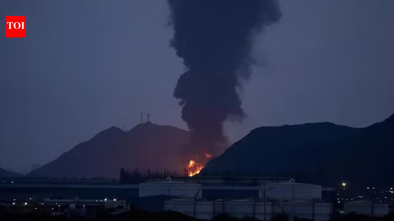 A large fire and plume of smoke can be seen after debris from a captured Iranian drone hit a Fujairah oil facility, according to authorities. (AP/PTI)