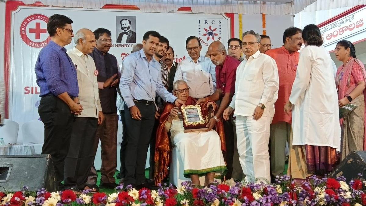 Collector Himanshu Shukla felicitated the donor during the silver jubilee celebrations of IRCS Cancer Hospital in Nellore on Wednesday. | Photo credit: ARRANGEMENT
