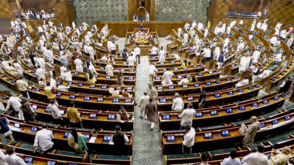 Members walk out after the Lok Sabha was adjourned sine die, during a special session of Parliament, in New Delhi, April 18, 2026 | Photo credit: PTI/Sansad TV