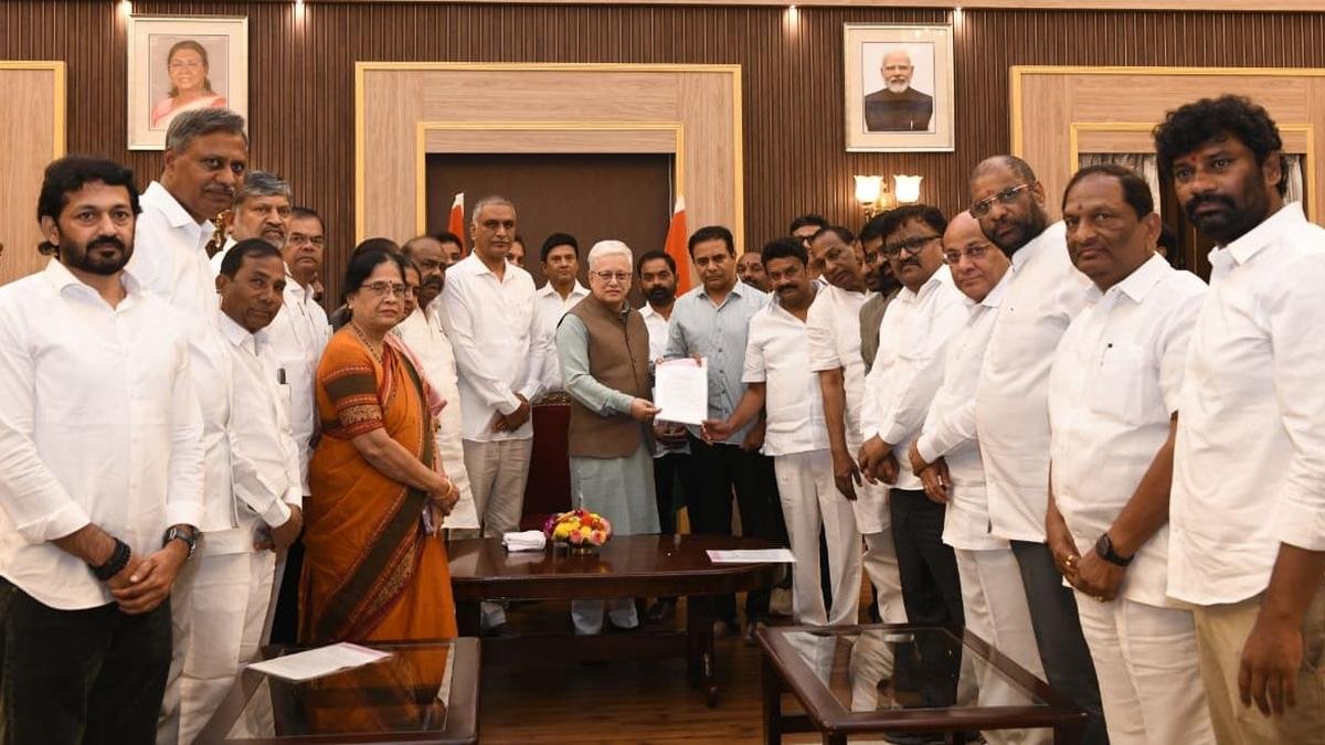 BRS leaders submit a memorandum to Governor Jishnu Devi Varma on Tuesday on alleged irregularities in Singareni OB tenders in Hyderabad. | Photo credit: By arrangement