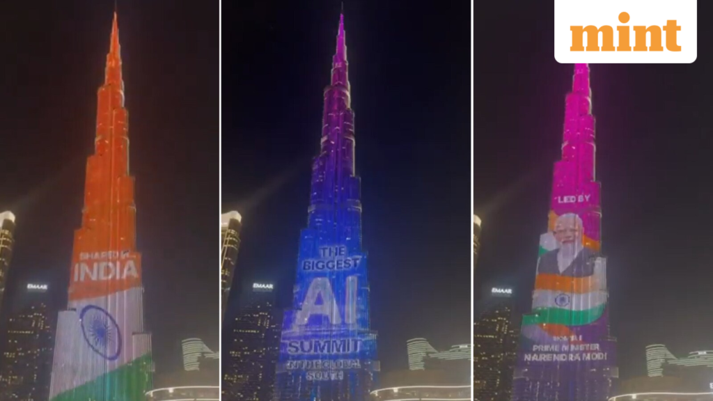 The Embassy of India in the UAE shared a video of the iconic building cheering on India with a light show on the X Burj Khalifa illuminated in tricolor projections with the words ‘Future of AI’ and ‘Led by India’.