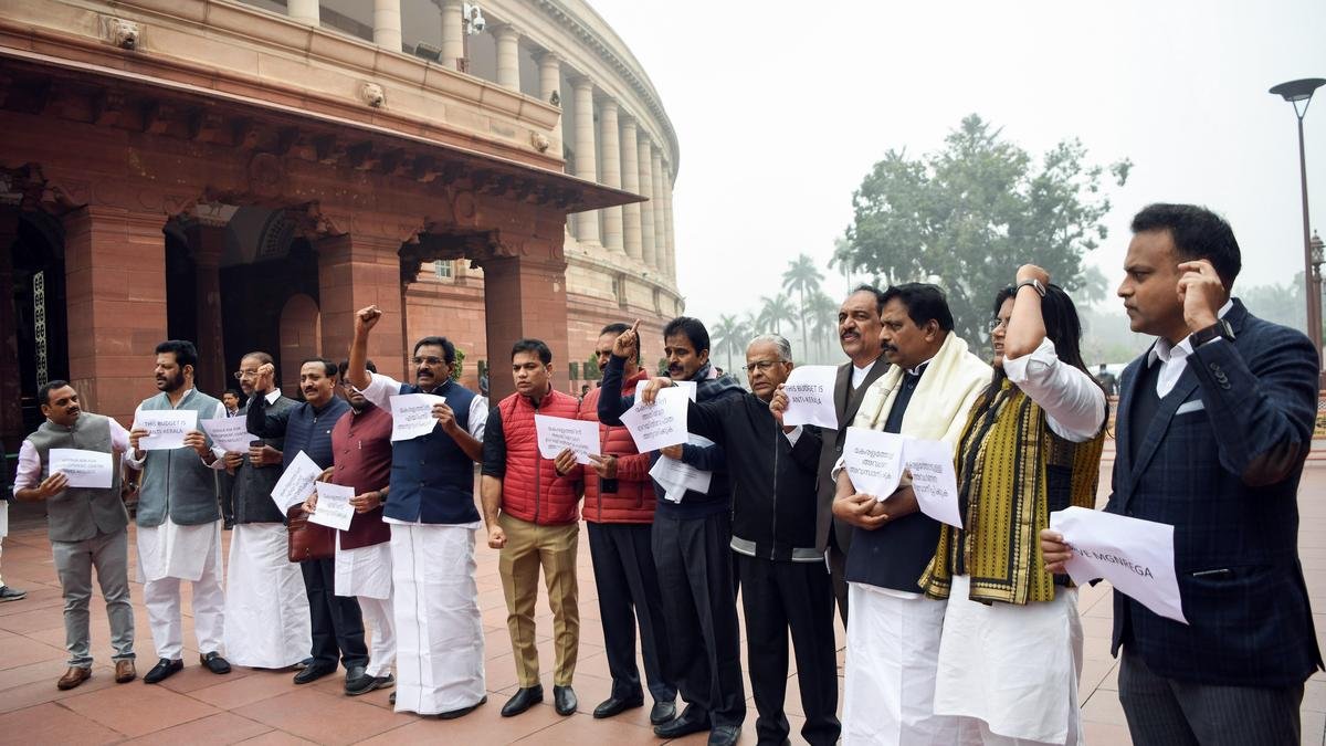 Congress MP KC Venugopal and other opposition MPs from Kerala protested the Union Budget 2026 terming it as an anti-Kerala budget at the Parliament premises in New Delhi on Monday. | Photo credit: ANI