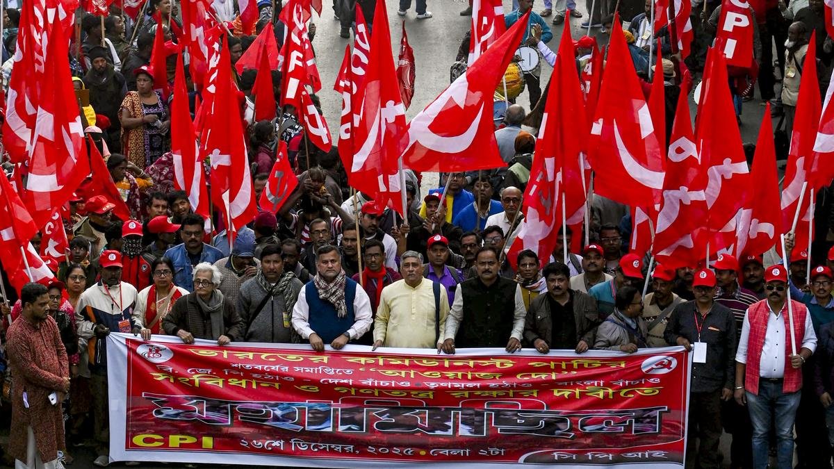 Leaders and workers of the Communist Party of India attend a rally to mark their party’s centenary in Kolkata on December 26, 2025. | Photo credit: PTI