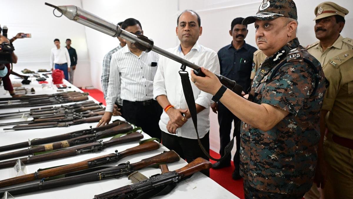 Director General of Police Harish Kumar Gupta inspects weapons recovered from surrendered Maoists in Vijayawada on Monday (March 30). | Photo credit: GN Rao
