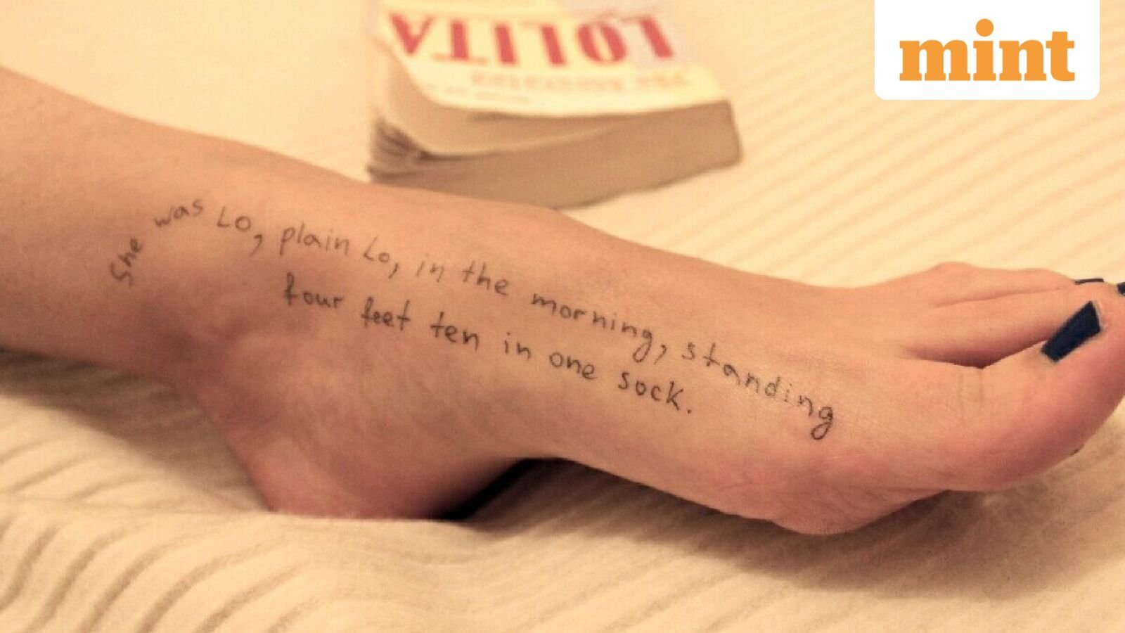 Another image shows a woman’s lower leg and foot on what appears to be a bed, with a paperback copy of Lolita in the background.