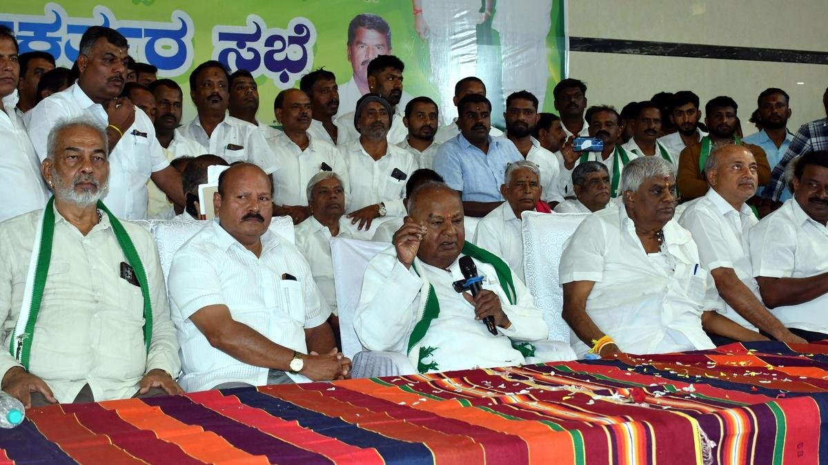 Former prime minister and JD(S) national president HD Deve Gowda held a meeting of party workers in Hassan on 29 December. Photo credit: PRAKASH HASSAN