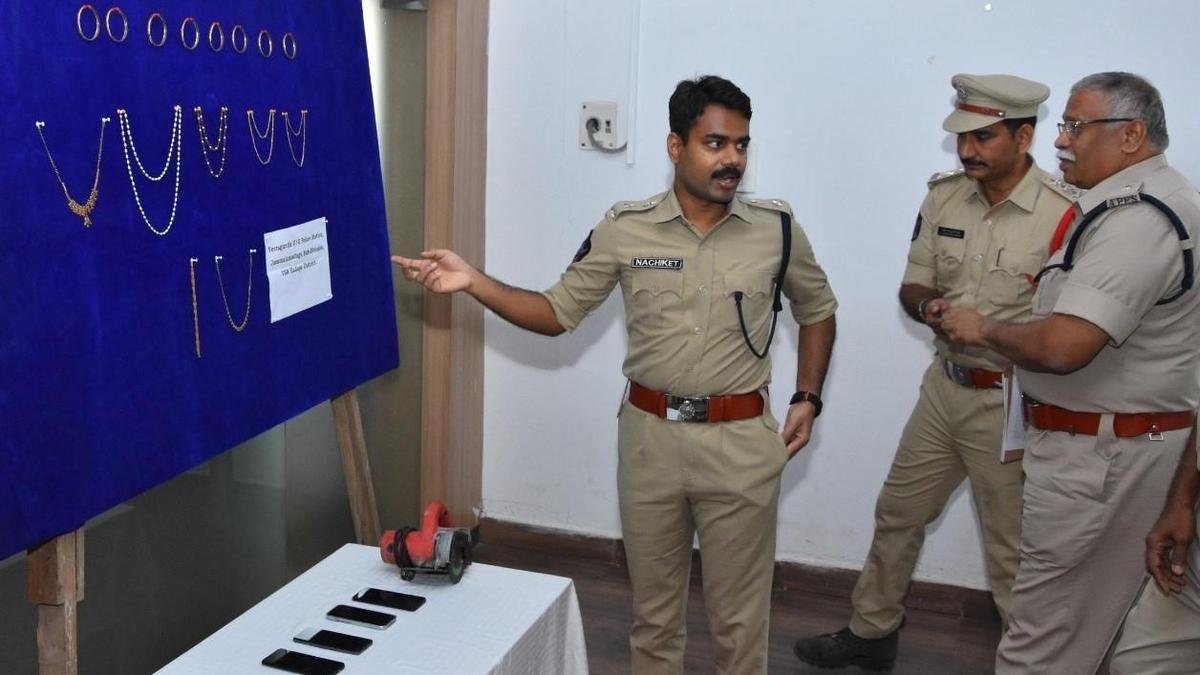 Superintendent of Police (SP) Nachiket Vishwanath Shelke displays the gold ornaments recovered from the accused in Kadapa on Tuesday. | Photo credit: ARRANGEMENT