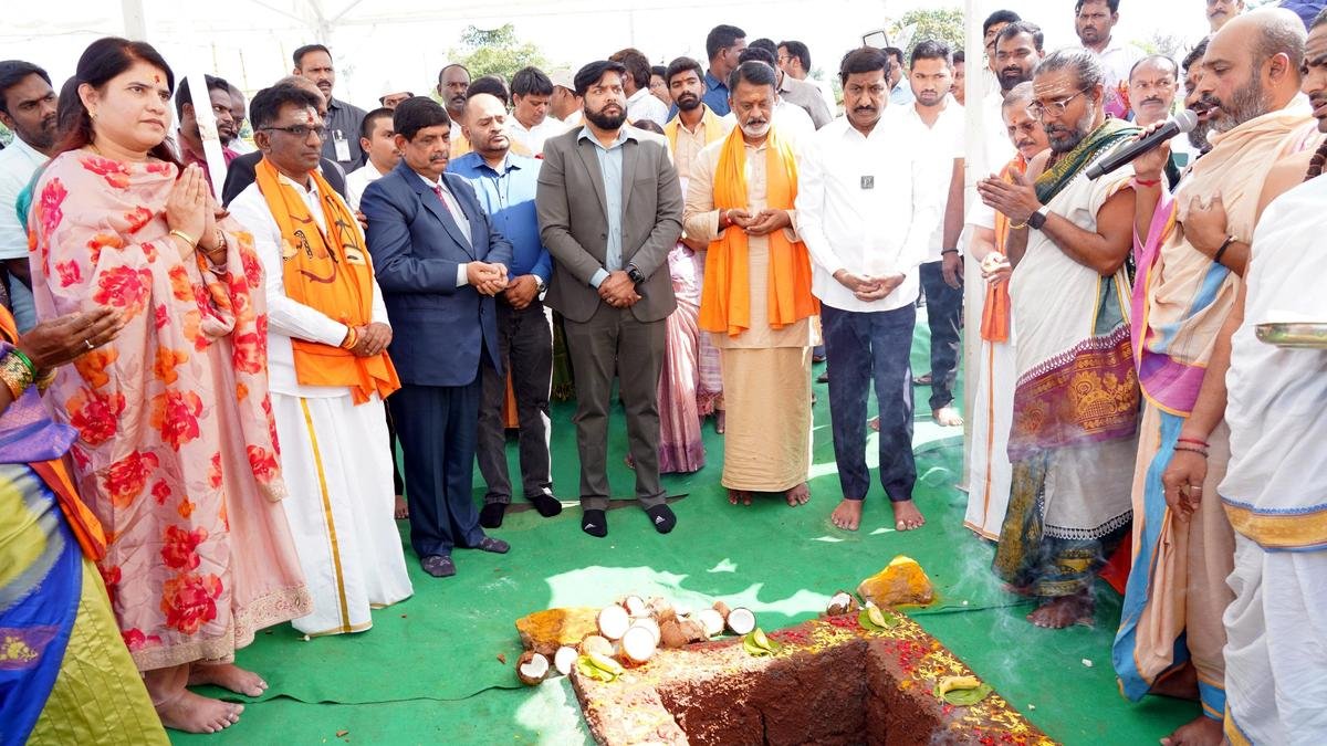 BC Roads and Buildings Minister Janardhan Reddy, District Collector Rajakumari Ganiya, Srisailam Temple Managing Director M. Srinivasa Rao and others at the bhumi puja of the proposed four-star hotel in Srisailam on Tuesday. | Photo credit: U. SUBRAMANYAM