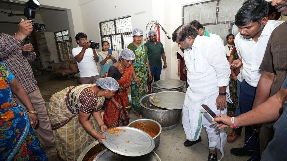 Deputy Chief Minister Mallu Bhatti Vikramarka inspects the canteen at Tribal Welfare Girls’ Gurukul College in Tanikella village of Khammam district on Wednesday. | Photo credit: SPECIAL PROVISIONS