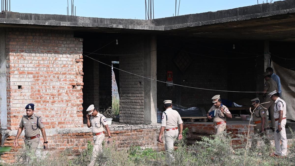 Additional Commissioner of Police, North, Pravesh Kumar and other officials at the site where historian ‘Thoppai Ganesh was shot dead in an encounter at Madhavaram in Chennai on March 16, 2026 | Photo credit: B. Jothi Ramalingam