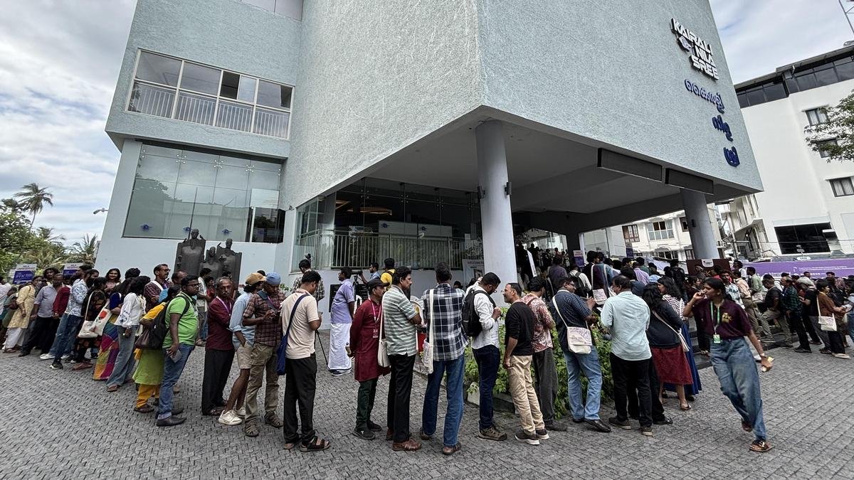 Film buffs queue up at the Kairali theater premises on Wednesday to watch Flames, which was denied permission by the center but was screened on the state government’s decision. | Photo credit: NIRMAL HARINDRAN