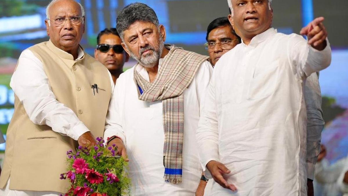 Congress President Mallikarjun Kharge and Deputy Chief Minister DK Shivakumar, among others, attend the foundation and foundation stone laying ceremony for various development works at Chittapur in Kalaburagi district on Sunday. | Photo credit: SPECIAL ARRANGEMENT
