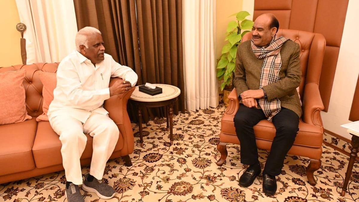 Rajya Sabha member Iranna Kadadi met Speaker Om Birla in New Delhi on Monday in support of the Belagavi district administration over the ban against Maharashtra MP Dhairyasheel Mane. | Photo credit: SPECIAL ARRANGEMENT