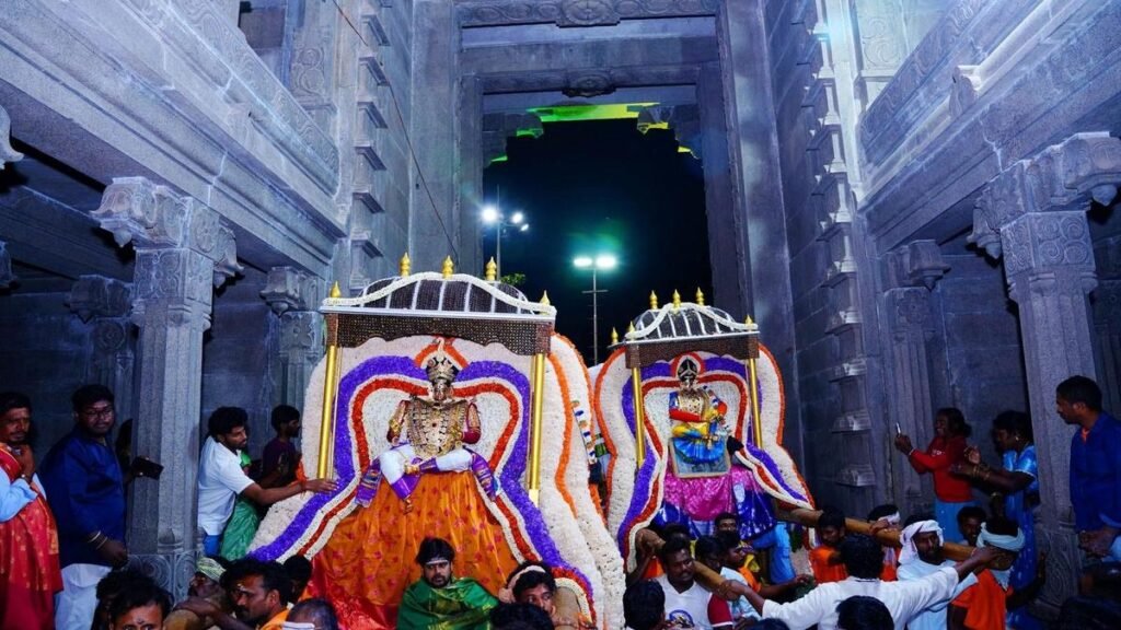 Idols of Lord Srikalahastheeswara and Goddess Gnana Prasunambika are carried on separate litters during the ‘Kalyanotsavam’ ritual at Srikalahasti temple in Tirupati district on Wednesday. | Photo credit: ARRANGEMENT