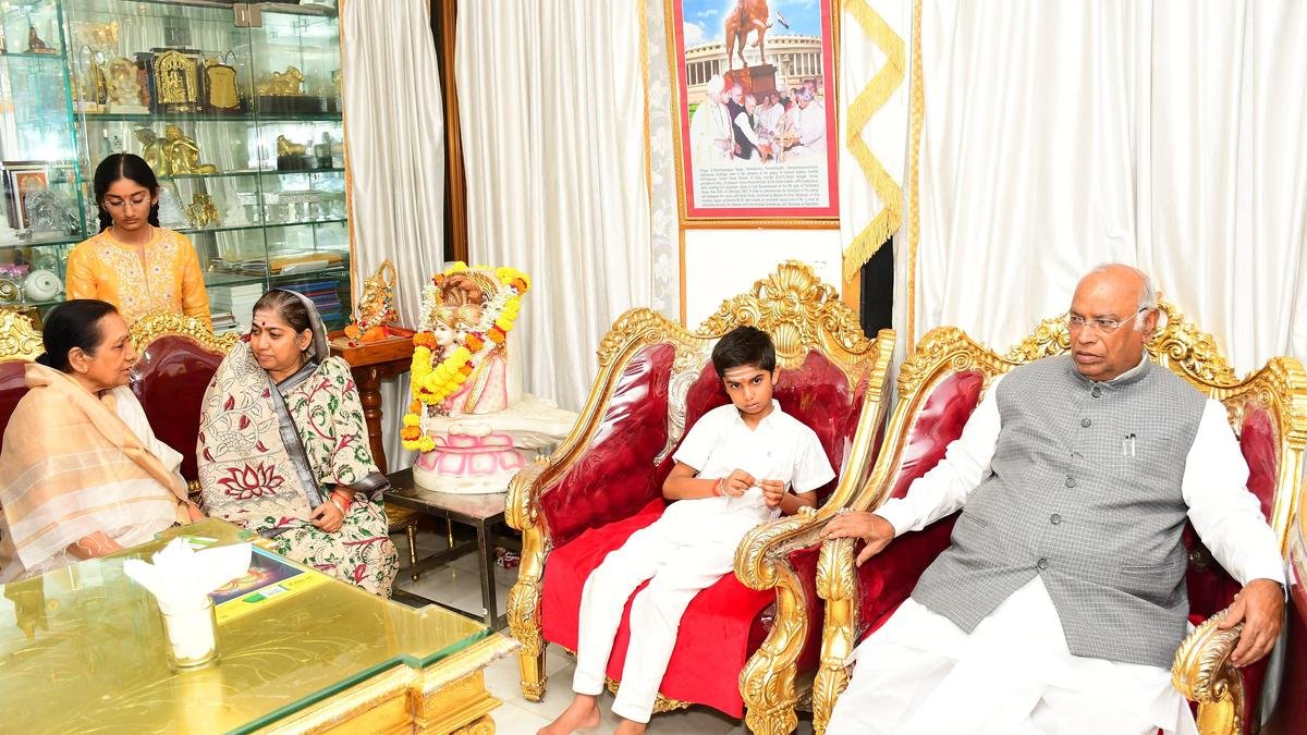 The President of the Congress and Rajya’s opposition leader Sabha Mallikarjun Kharge met the family members of the late Sharanabaswapp Appe, head of Sharanabasaveshware Sansthan, who recently died in his residence in Kalaburagag. | Photo credit