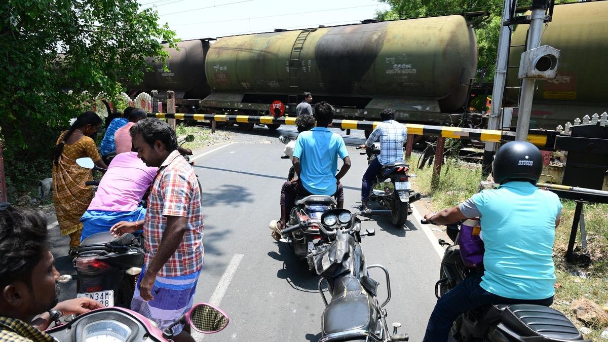 The level crossing at Nettavelampalayam in Namakkal’s Anangur is closed nearly 15 times a day. | Photo credit: Special arrangement