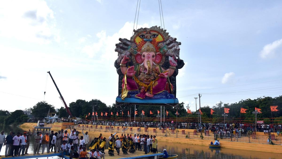 Ganesh Idol was immersed on Thursday with the help of a crane at Vinaak Ghat in Kurnool. | Photo Credit: U. SubraManyam