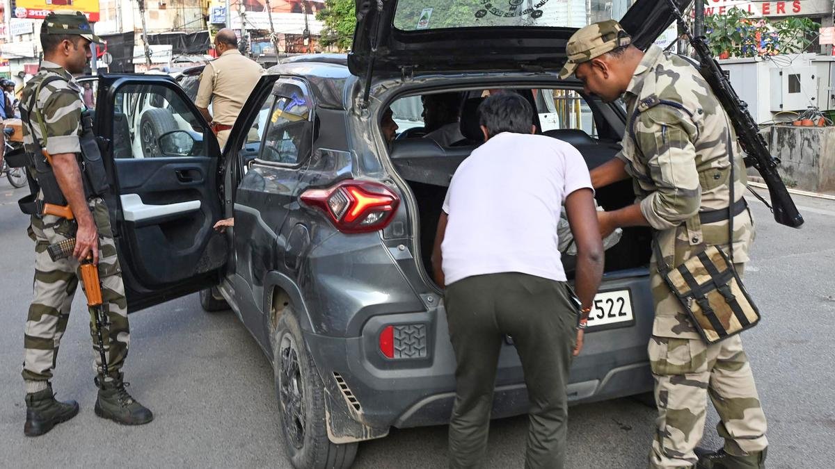 Security personnel check a car in front of them on October 11, 2025 in Patna. | Photo credit: ANI