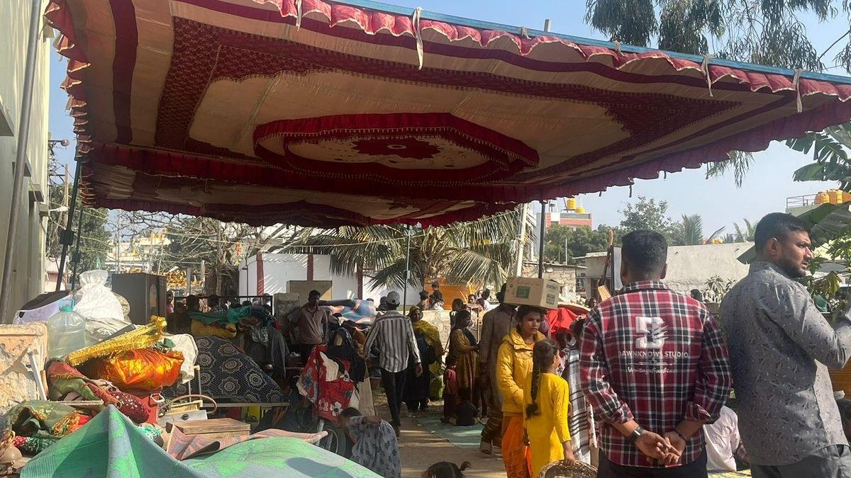 Household belongings of displaced families were bundled and kept outside on Saturday, a day after civic authorities demolished over 150 houses during a demolition drive at Kogil in Yelahanka. | Photo credit: SPECIAL ARRANGEMENT