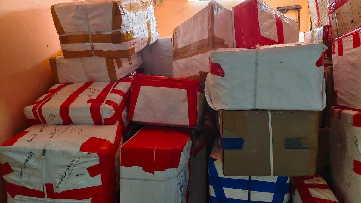 Based on Tip-off, a team of officials attacked Gohown in Samruddhi’s layout and confiscated 317 boxes of flip flops, which allegedly imposed the accusation without security measures. | Photo Credit: Special Arrangement