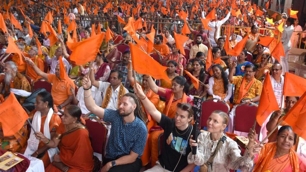Participants of an event organized for mass rendition of Hanuman Chalisa in Mysuru on Saturday. | Photo credit: MA Sriram