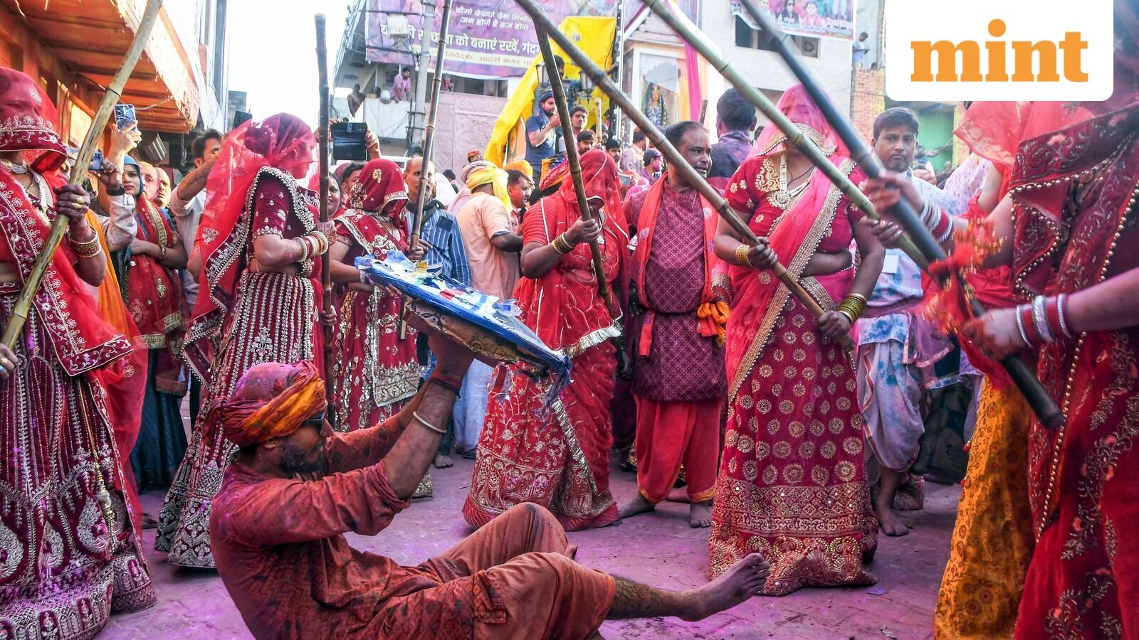 Holi celebrations began in Mathura’s Barsana – known as the abode of Krishna’s consort Radha – from Wednesday, February 25, when women and men play Lathmar Holi. Women dressed in traditional finery were seen playfully beating men with bamboo sticks as they shielded themselves.