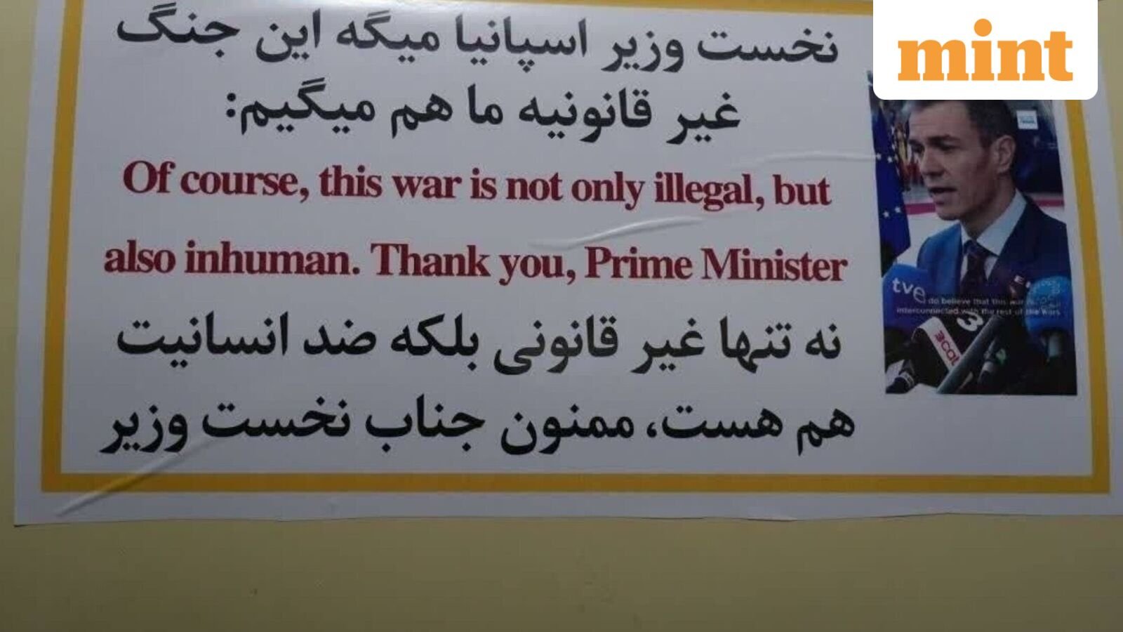 Stickers with Sanchez’s notes, in both English and Persian, read: “Of course this war is not only illegal, but also inhumane. Thank you, Mr. Prime Minister.”