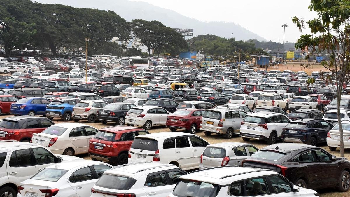 The parking lot at the Mysuru Palace was filled with vehicles due to the year-end surge in tourists. | Photo credit: MA SRIRAM