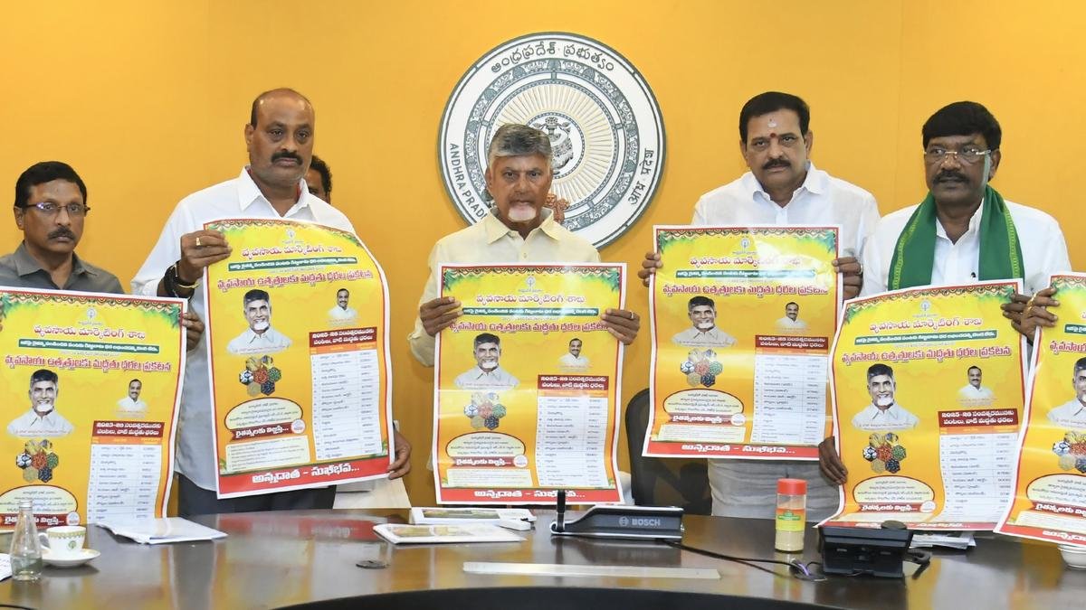 Main Minister N. Chandrababu Naida releases a poster on support prices for a review meeting on agriculture at the Secretariat in Amaravati on Thursday. | Photo Credit: Special Arrangement