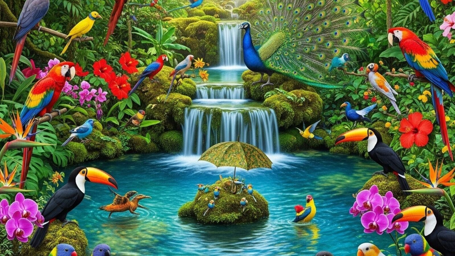 This optical illusion almost looks like a scene from the 2011 animated film, Rio. You have many colorful birds, flowers, green background and intact waterfall. The reflector is directly on the stunning peacock with open feathers. An ordinary umbrella is hidden somewhere in this picture. Can you try to find out in five seconds?