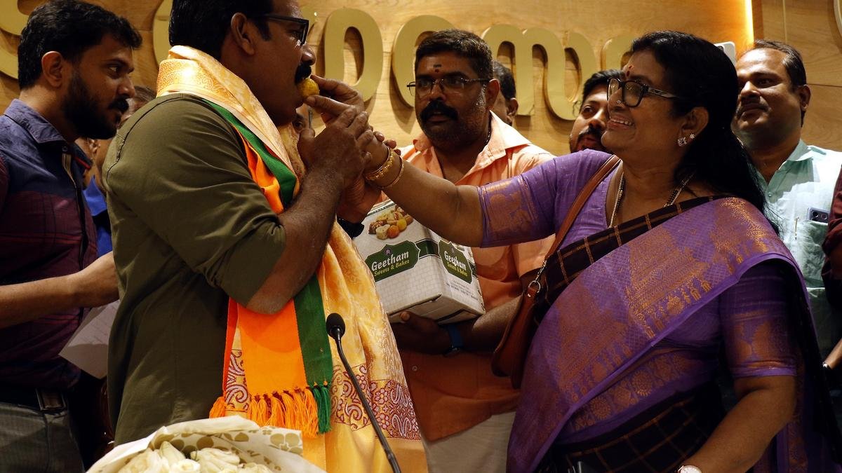 Outgoing Chairperson Prameela Sasidharan offers sweets to newly elected Palakkad Municipal Chairperson P. Smithesh after the swearing-in ceremony on Friday. | Photo credit: KK Mustafah