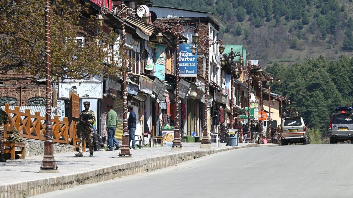 Security personnel in the town of Pahalgam, where tourist numbers are low after last year’s terror attack in which terrorists shot dead 26 people. | Photo credit: Imran Nissar