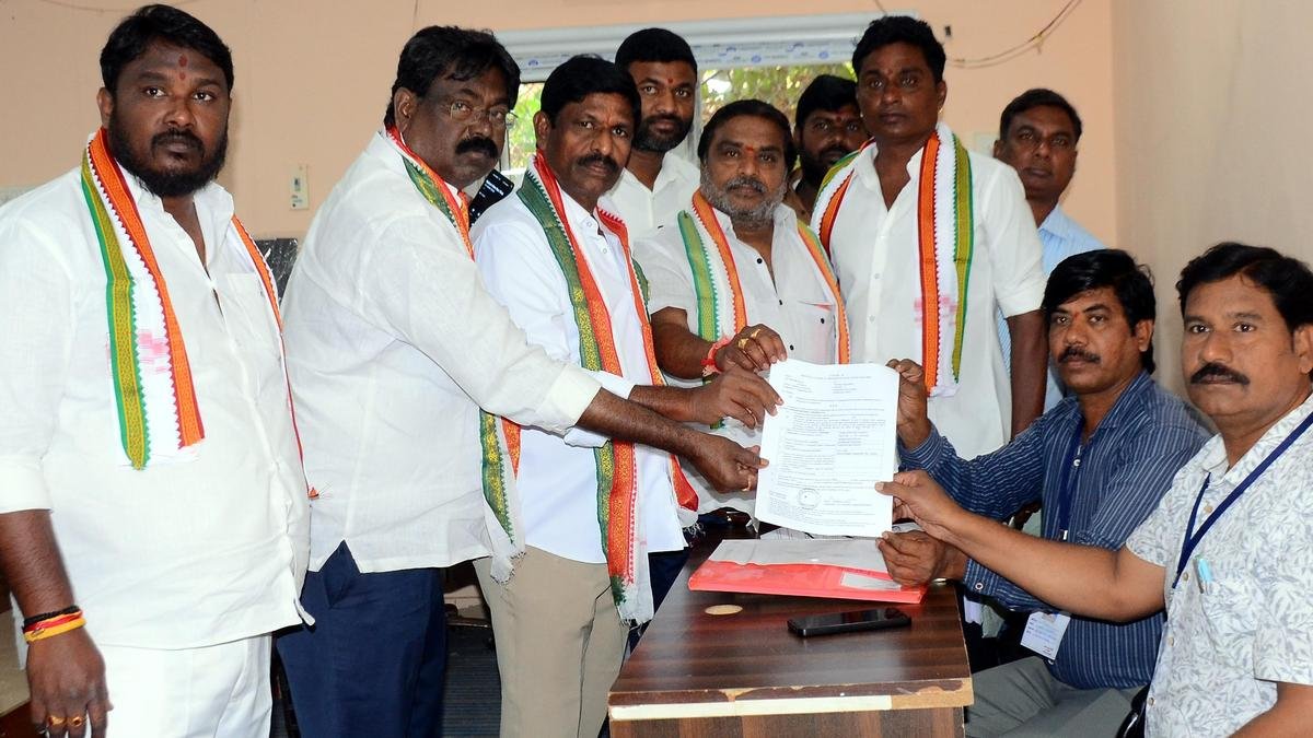 Congress leaders hand over Form B at Sangareddy Municipal Office on Monday. | Photo credit: MOHD ARIF