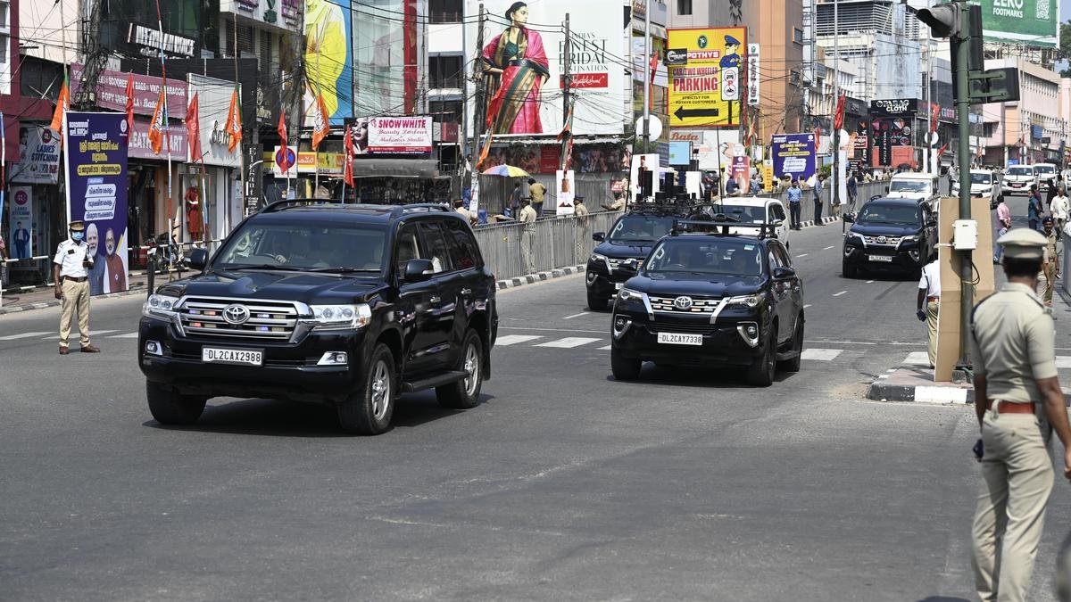 Rehearsals for Prime Minister Narendra Modi’s motorcade passing through MG Road in Thiruvananthapuram on Thursday. Mr. Modi is scheduled to arrive in the city on Friday. | Photo credit: JAYAMOHAN A.