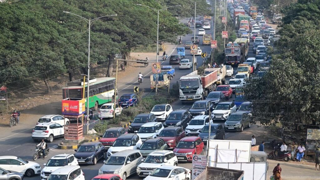 Long queues of cars, buses and other vehicles due to heavy traffic on Vijayawada-Hyderabad State Highway in Ibrahimpatnam and nearby stretches on Saturday. | Photo credit: GN RAO