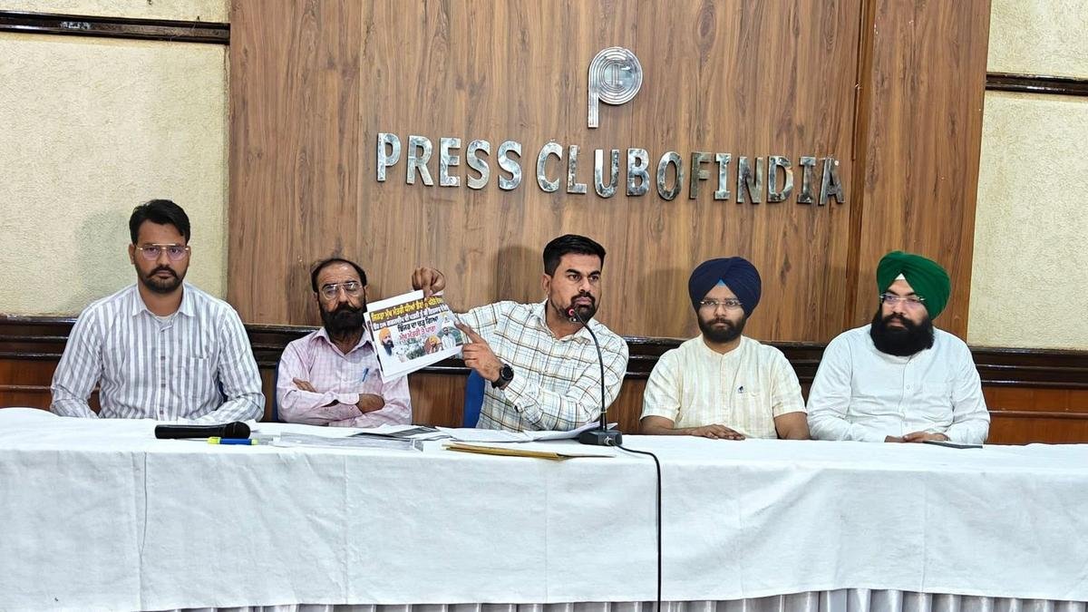 Members of the Press Committee Di Azaadi Bahal Karo Sangharsh Punjab (Committee for the Struggle for Restoration of Press Freedom) address the media in New Delhi on April 27, 2026. Photo: Special Arrangement