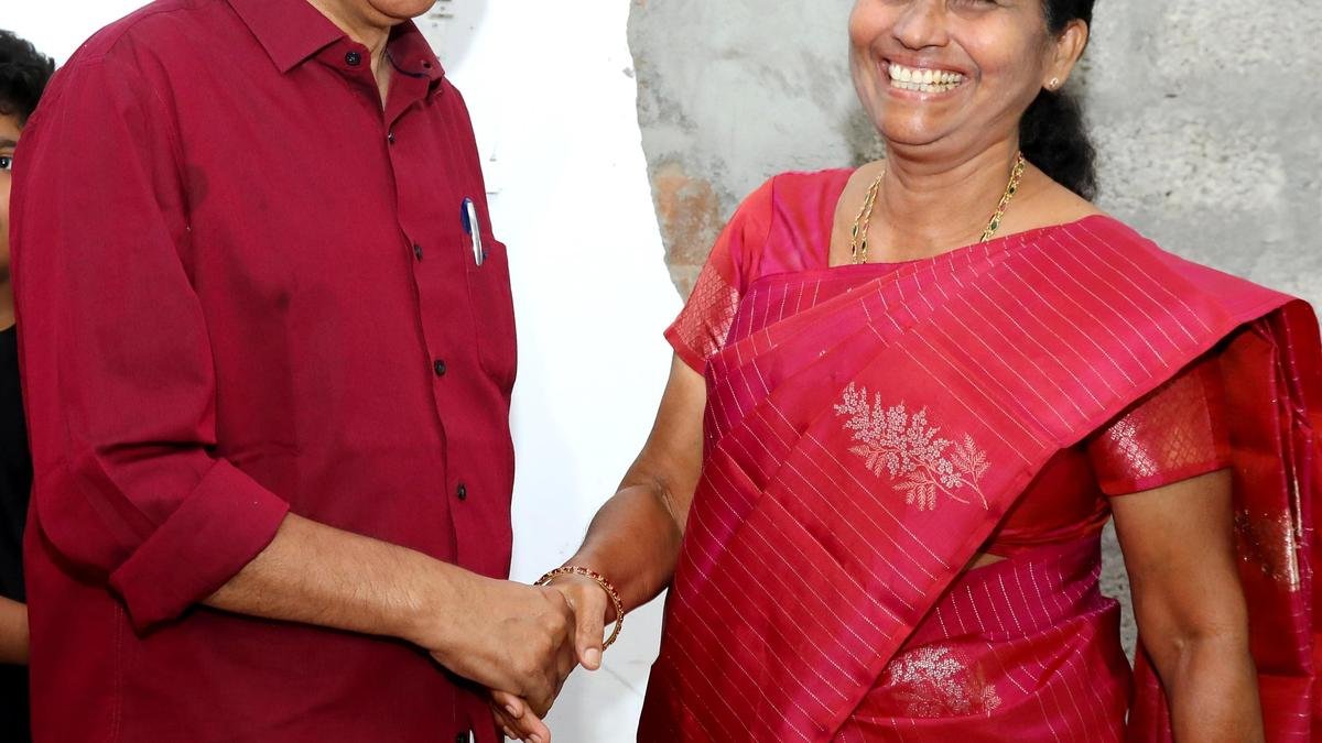 Civil Supplies Minister GR Anil congratulates his wife R. Latha Devi on being elected Kollam district panchayat president on Saturday | Photo credit: C. SURESHKUMAR