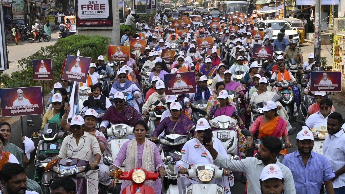 Bharatiya Janata Yuva Morcha in collaboration with BJP Mahila Morcha leaders organized a rally in Hyderabad on Wednesday in support of women empowerment and 33% reservation bill for women. | Photo credit: NAGARA GOPAL