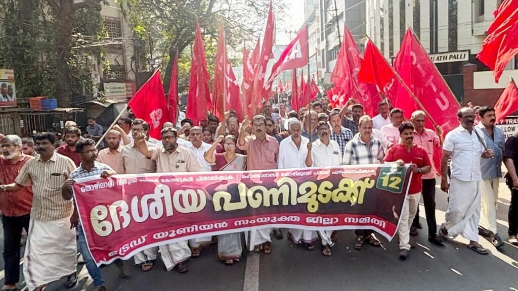 Union workers are protesting in Kozhikode city in solidarity with the general strike against the alleged anti-labour policies of the Union government on Thursday. | Photo credit: K. Ragesh