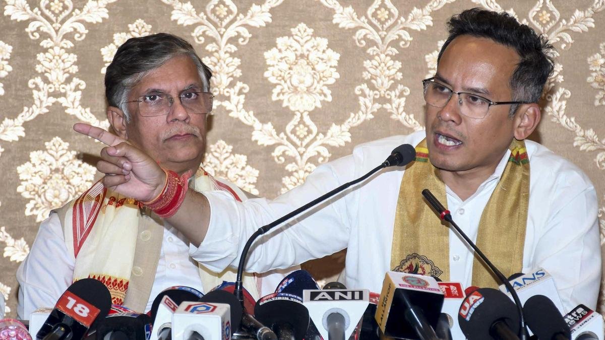 Assam Pradesh Congress Committee President Gaurav Gogoi with Congress leader Pawan Khera addressing a press conference in Guwahati on April 5, 2026 | Photo credit: PTI