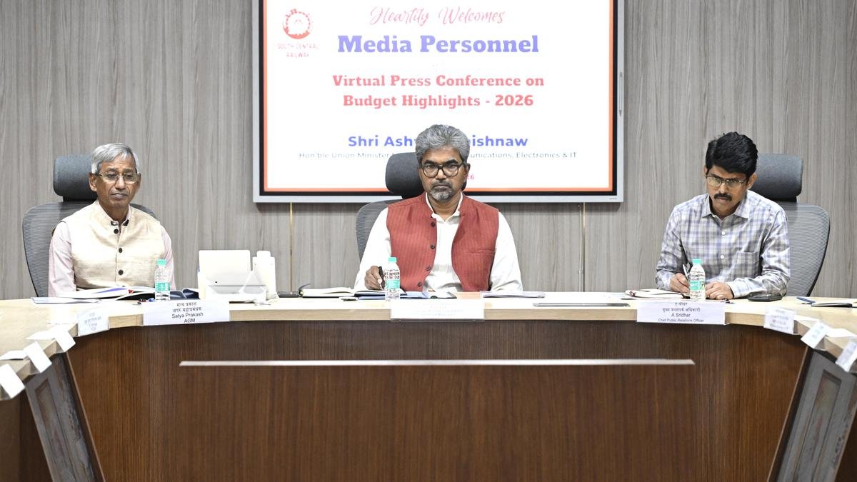 South Central Railway General Manager Sanjay Kumar Srivastava along with SCR senior officials watch Union Minister for Railways, Information and Broadcasting and IT Ashwini Vaishnaw for a virtual press conference on Union Budget 2026-2027 highlights for Telangana and Andhra Pradesh at GM Conference Hall, Rail Nilayam, Secunderabad on Monday. | Photo credit: RAMAKRISHNA G