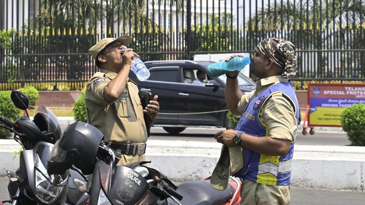 Police officers take a short water break amid the summer heat near the Telangana Secretariat in Hyderabad on Saturday, April 25, 2026. Photo: SIDDHANT THAKUR/The Hindu. | Photo credit: SIDDHANT THAKUR