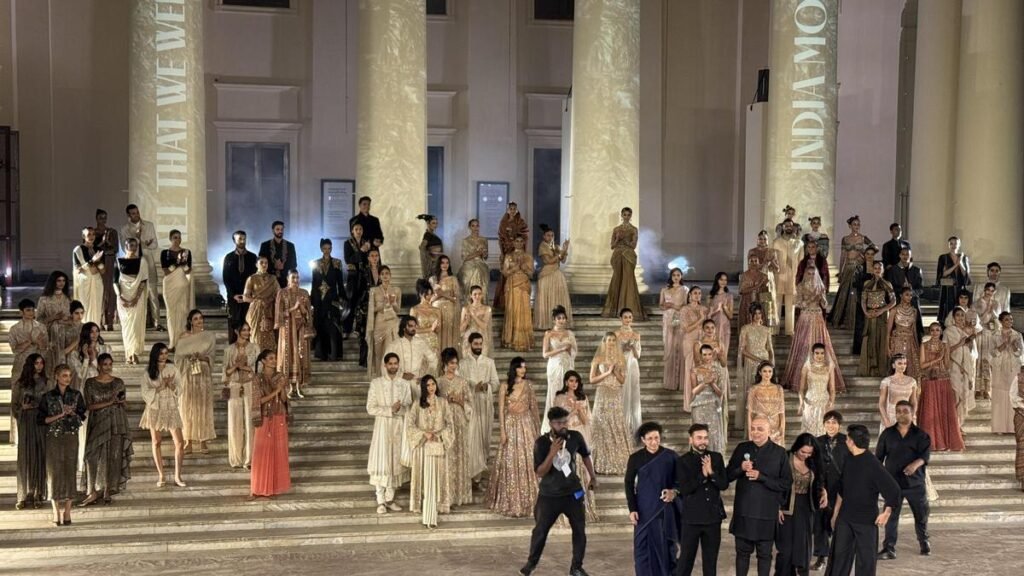 The steps of the restored Residency building have been transformed into a runway for Tarun Tahiliani’s fashion. | Photo credit: Serish Nanisetti