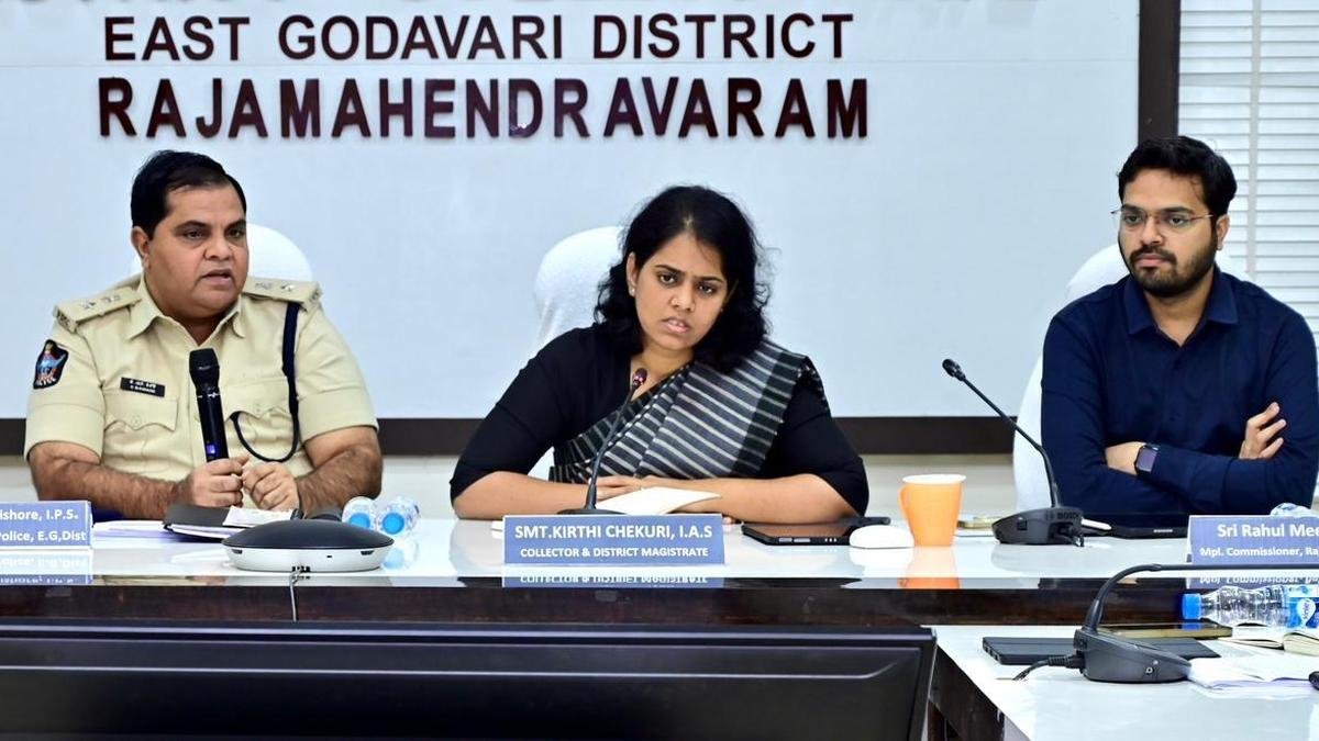 East Godavari District Collector Keerthi Chekuri during the review meeting on Godavari Pushkarams-2027 in Rajamahendravaram town on Friday. | Photo credit: BY ARRANGEMENT
